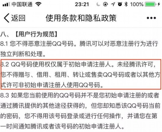 中国青年报(ID:zqbcyol)查询了常用的几种App使用条款:《QQ号码规则》中明确表示,QQ号码使用权仅属于初始申请注册人。未经腾讯许可,用户不得赠与、借用、租用、转让或售卖QQ号码或者以其他方式许可非初始申请注册人使用QQ号码。
