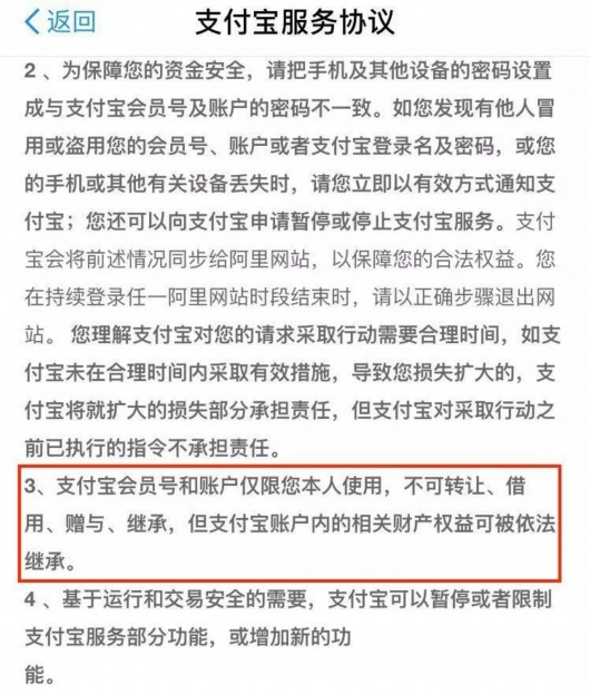 但在支付宝服务协议中则明确规定:支付宝会员号和账户仅限用户本人使用,不可转让、借用、赠与、继承,但支付宝账户内的相关财产权益可被依法继承。